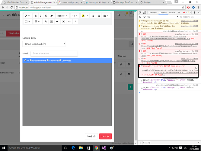 Anh chị và các bạn cho mình hỏi. Trang chính thì đoạn html + script google map chạy tốt. Nhưng khi mình bỏ chúng vào 1 modal. Cụ thể 1 file modal.html, sau đó include vào trang chính thì nó không hoạt động nữa. Nó báo lỗi “Uncaught TypeError: Cannot read property ‘firstChild’ of null”.