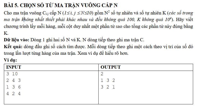 Sinh mọi hoán vị của [0 … N - 1] gọi là P. rồi với mỗi i thì lấy C[i][P[i]], tổng cộng lại bằng thì in hoán vị đ ó ra.