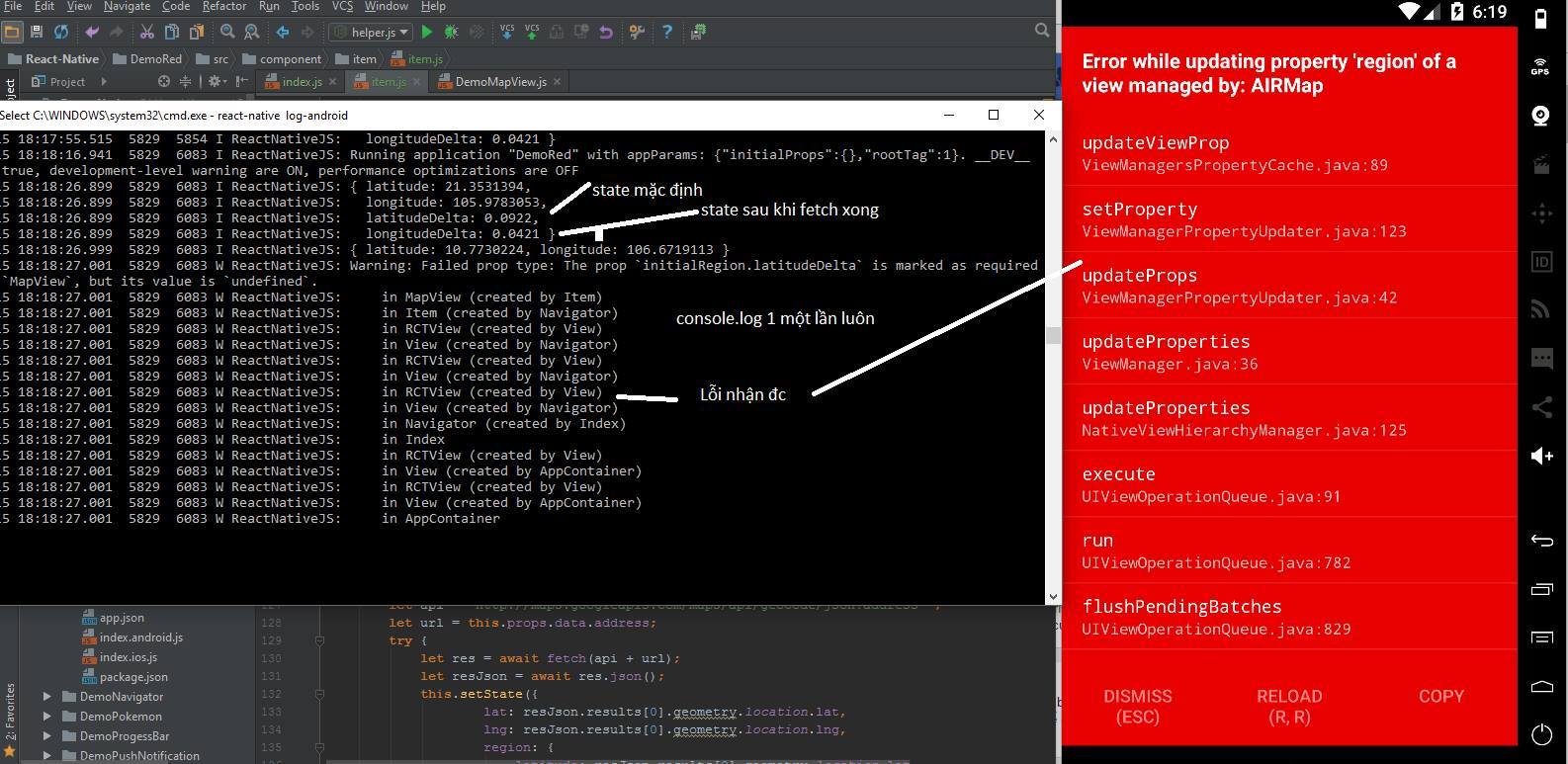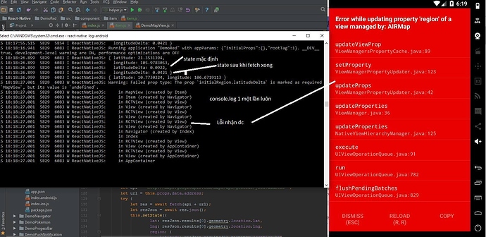 Vấn đề: Nhưng khổ nỗi là cái MapView của mình nó render ra trước cả cái hàm fetch(api). Đén lúc MapView render xong thì hàm fetch(api) mới xong. Vì thế MapView nó báo lỗi ko thể cập nhật dữ liệu