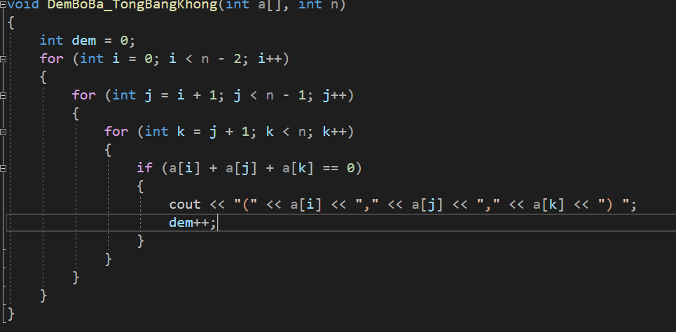 Cho em xin ý tưởng về đếm và liệt kê bộ 3 phần tử ai,aj,ak với ai+aj+ak=0 và i<j<k. Mà k dùng đến 3 vòng for ạ!